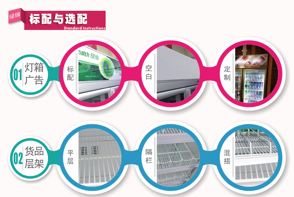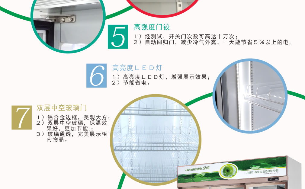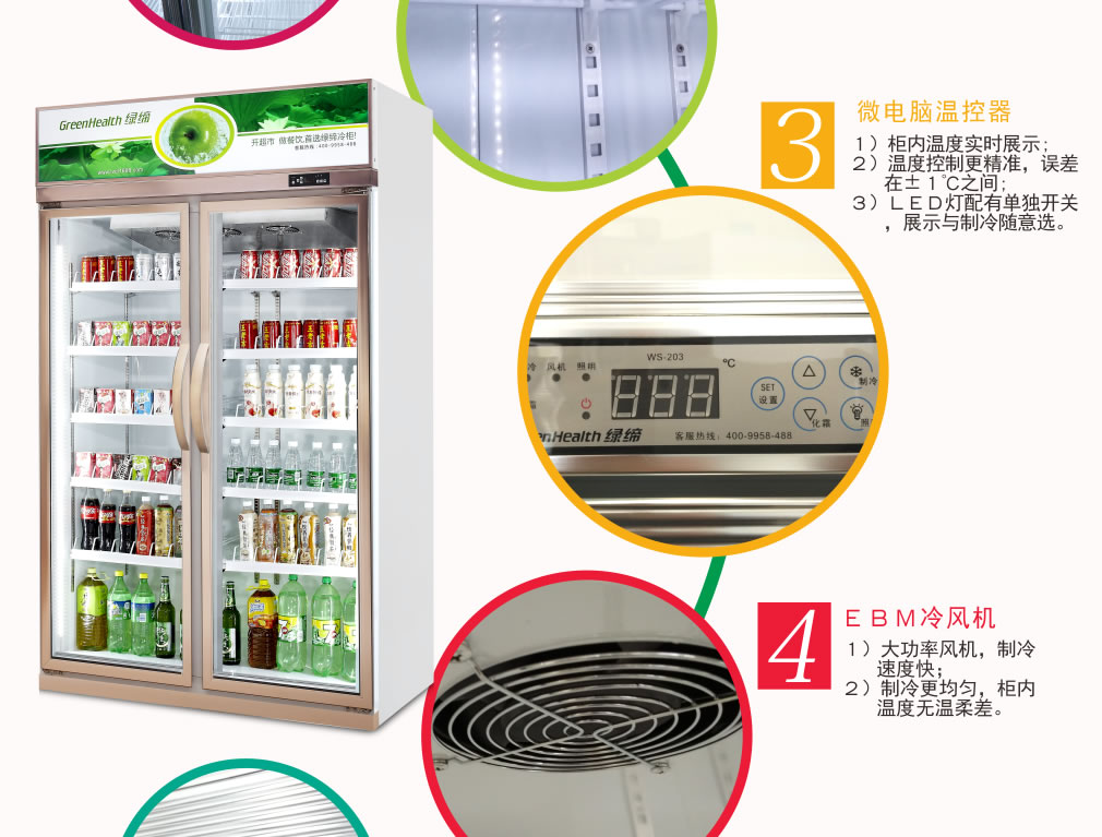 全封閉門封,不銹鋼層架勾,微電腦溫控器,EBM冷風(fēng)機(jī),高強(qiáng)度門鉸,高亮度LED燈,雙層中空玻璃門,360度旋轉(zhuǎn)輪,純鋼管翅片式蒸發(fā)器,翅片式冷凝器