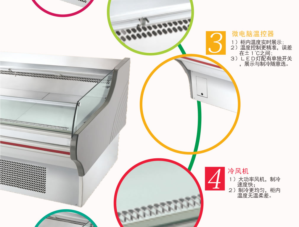 ① 風(fēng)扇或空調(diào)出風(fēng)口不能正對(duì)敞口式冷柜吹風(fēng);